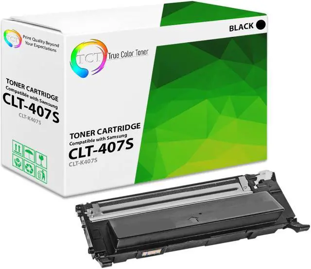 TCT offers quality Samsung CLT-407S CLT-K407S compatible replacement cartridges that fit effortlessly into your printer. You will find crisp, clear prints with consistently dark tones and sharp images in every single print job. Get professional quality prints every time and save a bundle with True Color Toners high quality printing supplies!