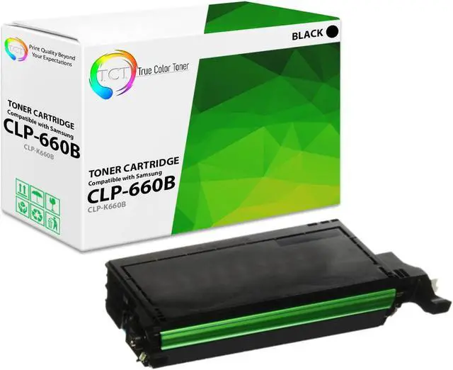 TCT offers quality Samsung CLP-660B CLP-K660B compatible replacement cartridges that fit effortlessly into your printer. You will find crisp, clear prints with consistently dark tones and sharp images in every single print job. Get professional quality prints every time and save a bundle with True Color Toners high quality printing supplies!