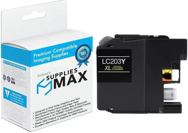 SuppliesMAX High Yield Inkjet compatible replacement for Brother LC-203Y. Yields up to 550 pages at 5% coverage. Premium ink delivers vibrant color and sharp text for photos, presentations, and everyday documents. Engineered for reliable performance, long-lasting results, and seamless installation in supported 110V U.S.-based printers.