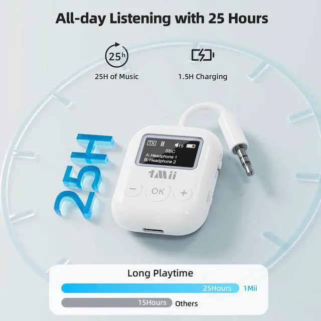 3. Latency depends on headphones. aptX LL: 30-50ms, aptX AD: 50~80ms, Standard Bluetooth SBC:150-250ms (lip-sync: may be noticeable).