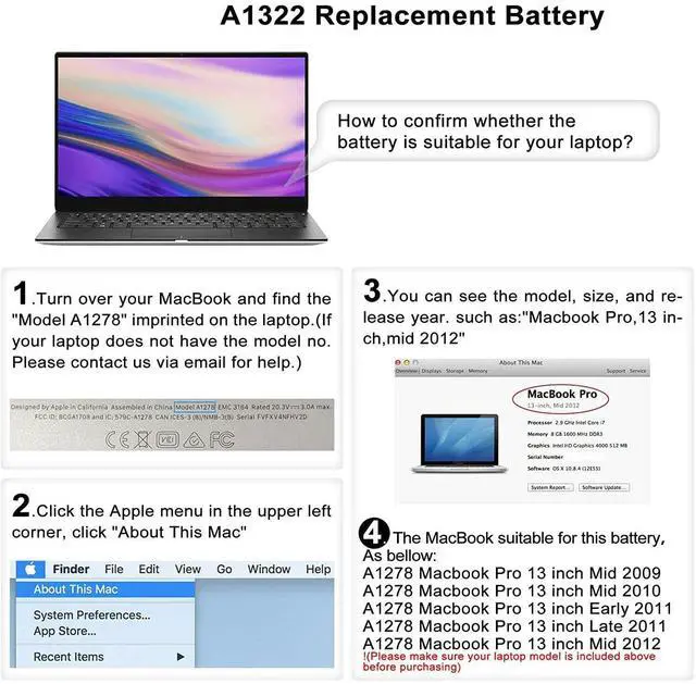 Compatible Laptop ModelsA1322 A1278 Battery For MacBook Pro 13 inch Mid 2012,Late 2011,Early 2011,Mid2010,Mid 2009.