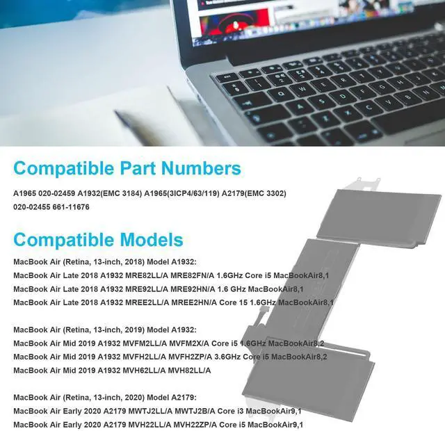 | Compatible with | for MacBook Air 13" Retina A1932 (2018 2019, Early 2020) A2179 EMC 3184 3302 MacBook Air8,1 8,2 9,1 MRE82 MRE92 MVFH2 | for MacBook Air 13 inch A1377 A1369 (Late 2010 Mid 2011 Mid 2012 Mid 2013 Early 2014 Version) | for MacBook Pro A1398 (Mid 2012 & Early 2013) Battery Replacement to MacBook Pro 15-inch Retina (Mid 2012, Early 2013 Version) | for MacBook Pro 15 Inch Retina A1398 (Late 2013, Mid 2014, Mid 2015 Version), NOT fit for A1398 (Mid 2012 Early 2013), P/N:020-00079 02000079 | for MacBook Pro 13 Inch A1708 (Late 2016, Mid 2017, Mid 2019, 2020), EMC 2978 3164, A2171 Battery for MacBook Pro 13 Inch A2159 (2019) A2289 (2020) A2338 (2020) | for MacBook Pro 13 inch Retina A1493 [ Early 2015, Mid 2014, Late 2013 ], EMC 2678 2875 2835 ME864 ME865 MF839 MF840 MF843 MF841 if123-054-5 |