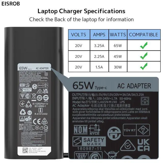 1.Power Specs: Input: 100-240 V~1.7 A 50-60 Hz, Output: 20 V?3.25 A 65 W, 15 V?3 A 45 W, 9 V?3 A 27 W, 5 V?3 A 15 W, Max Power: 65 Watt (Compatible with 60 W 45 W USB C charger). Connector Size: USB Type C