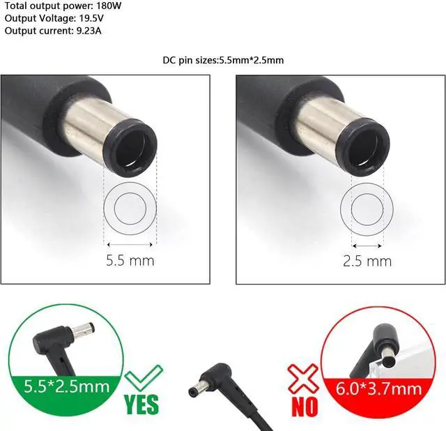 POWER SPECS: AC input:100 - 240V / 50-60Hz DC output:19.5V/9.23A Power: 180W Connector size: 5.5*2.5mm (Please check the Plug size of the charger! Please pay attention ! ! ! ).