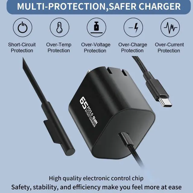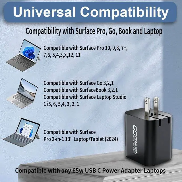Compatibility with Surface Pro, Go, Book and Laptop and 65W USB C Laptop Charger