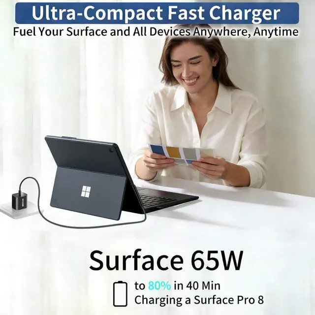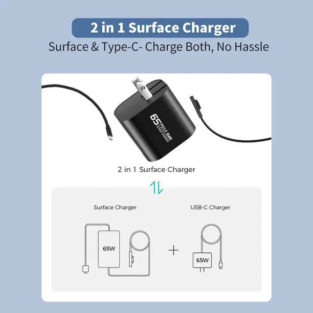 2-in-1 Charging SolutionThe compatibility is spot on. Compatible with both USB C and Microsoft surface connector chargerIt works perfectly with a wide range of laptops, tablets, gaming devices, and phones. The 65W power output ensures fast and efficient charging, getting even a laptop back to full power quickly