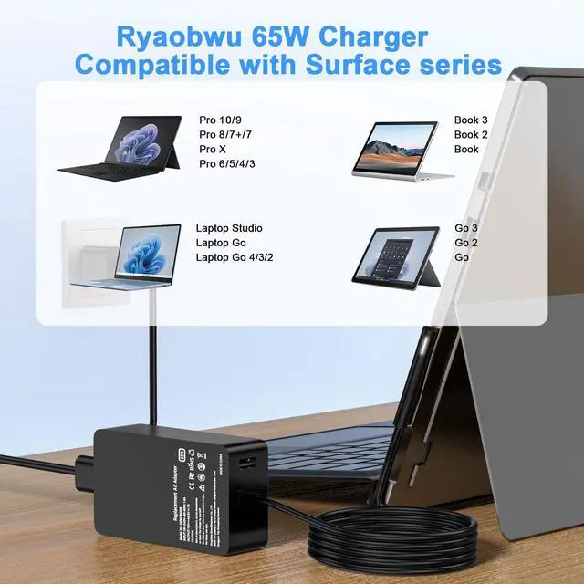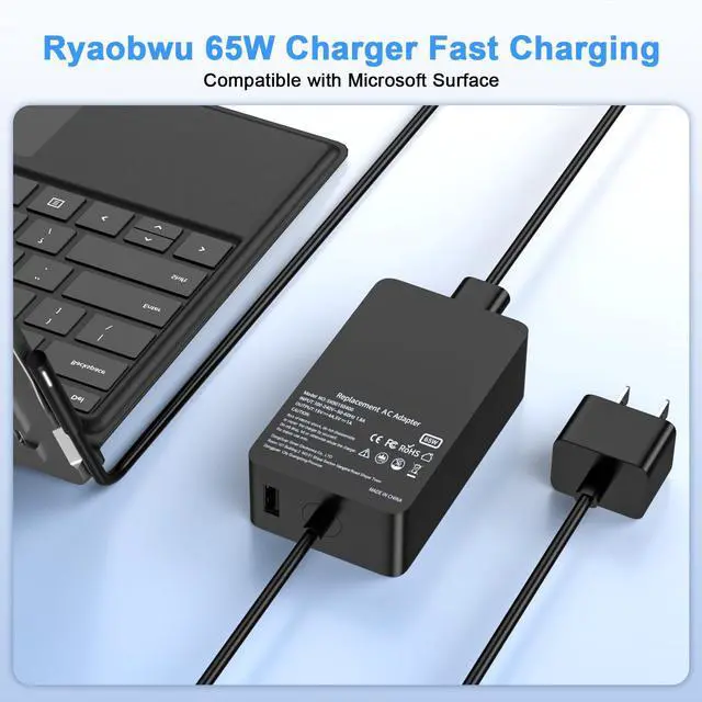Ryaobwu 65w laptop charger Compatible with Microsoft Surface Pro 11, 10, 9, 8, 7+, 7, 6, 5, 4, 3, X, Compatible with Windows Surface Laptop 7, 6, 5, 4, 3, 2, 1, Compatible with Surface Book 3, 2, 1, Compatible with Surface Go 3, 2, 1