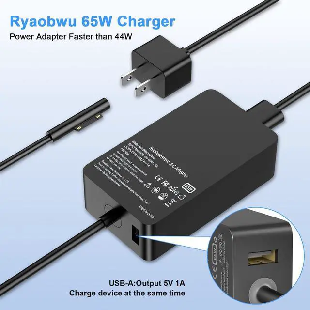 Ryaobwu charger Compatibility Performance, Model:65W-A1706; Input AC:100-240V 50/60 Hz; Output DC: 15V- 4A 65W, USB-A Port: 5V-1A 5W USB 2.0 for cell Phone, And also compatible with Microsoft Surface pro 44W 15V-2.58A and 36W 12V-2.58A