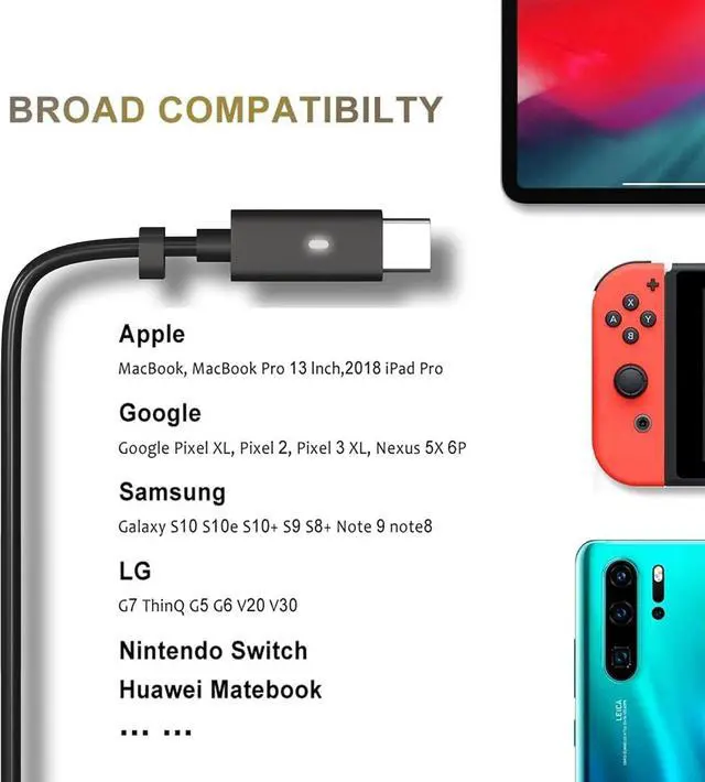This charger is compatible with all laptops, tablets, phones and other electronics requiring USB-C connector.
