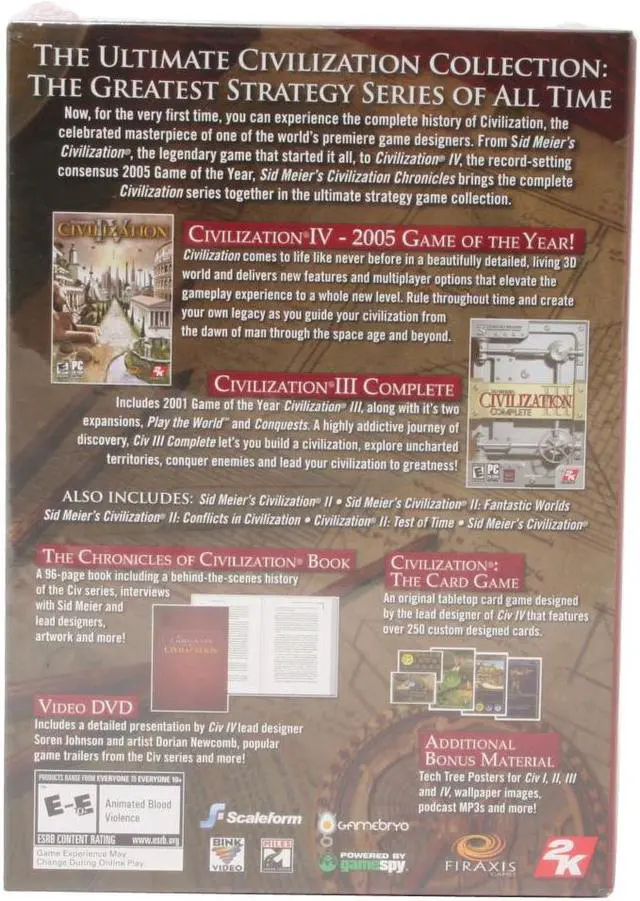 | Features | With more than six million units sold, Sid Meier's strategy and simulation-driven Civilization is recognized as one of the greatest gaming franchises of all time, and now for the first time, the entire series is compiled in one behemoth package. The set will include: Sid Meier's Civilization I, Sid Meier's Civilization II, Civilization II: Fantastic Worlds, Civilization II: Conflicts in Civilization, Civilization II: Test of Time, Sid Meier's Civilization III, Sid Meier's Civilization III: Play the World, Sid Meier's Civilization III: Conquests and Sid Meier's Civilization IV. |