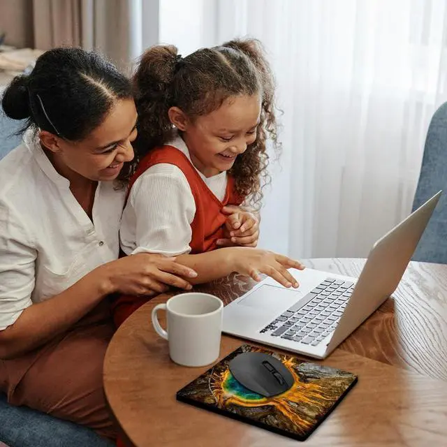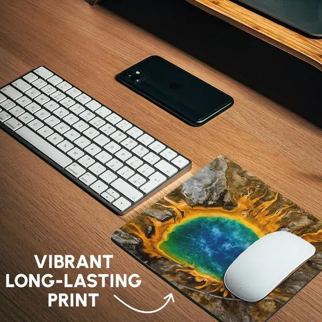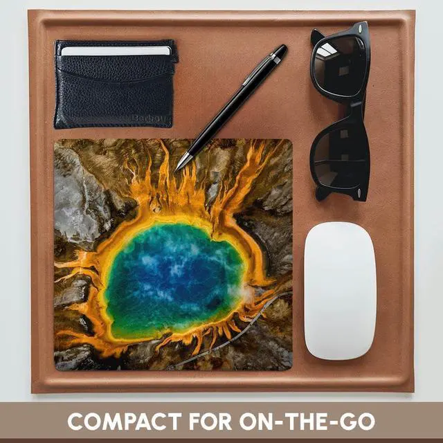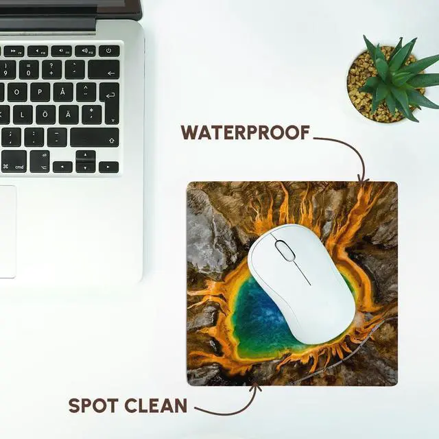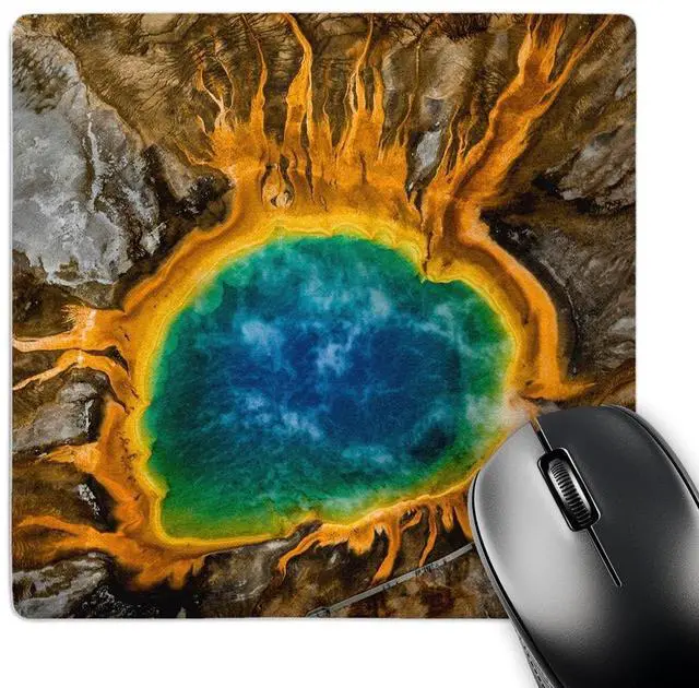 Grand Prismatic Spring, thermal features, Yellowstone NP, Wyoming, USA Mouse Pad is 8" x 8" x .25" and is made of heavy-duty recycled rubber. Matte finish image will not fade or peel. Machine washable using a mild detergent and air dry.