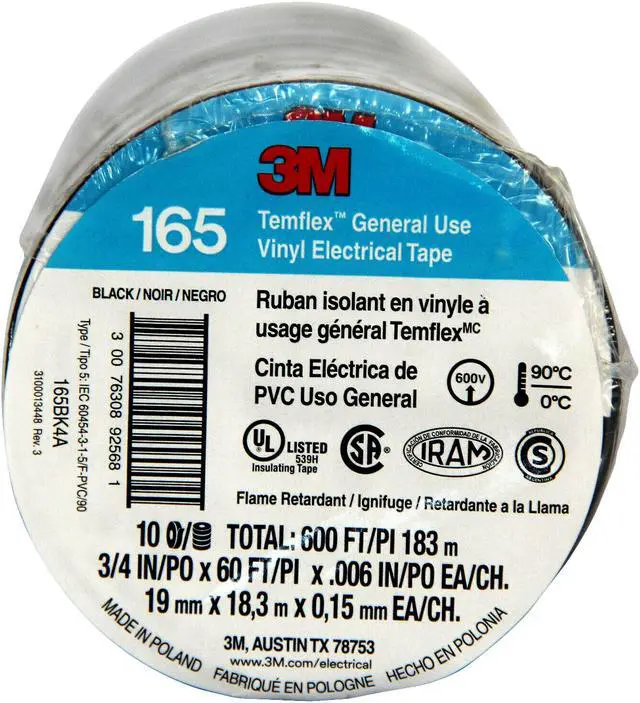 3M™ Temflex™ Vinyl Electrical Tape 165 is good quality, multi-purpose vinyl insulating tape. It has great resistance to moisture and varying weather conditions. It is a polyvinyl chloride (PVC) tape that is flame-retardant and conformable. 3M Temflex 165 Tape provides great mechanical protection with minimum bulk. It is a UL Listed and CSA Certified “Insulating Tape.”