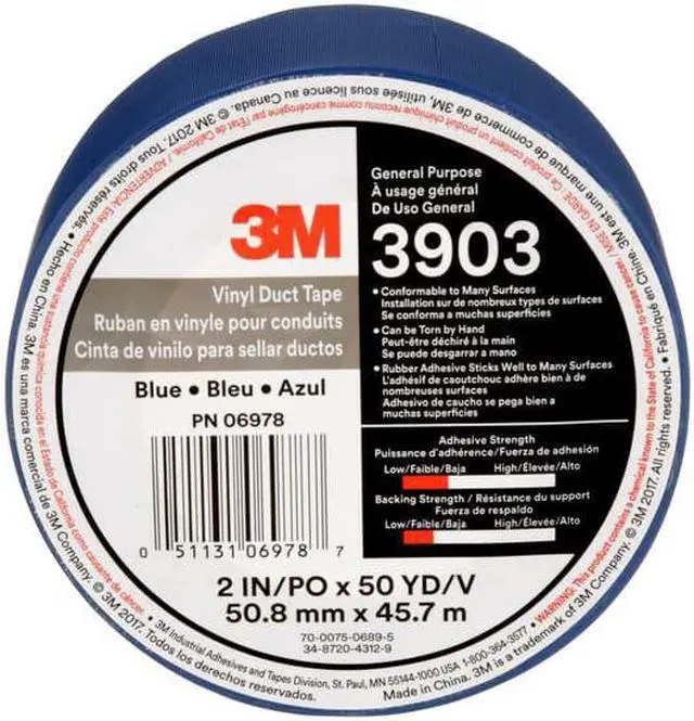 Adhesion to Steel 15.4 oz/in, Tape Brand 3M (TM), Assembly and Manufacturing, General Maintenance and Repair, Safety, Warehouse, Environment Indoor, Imperial Tape Length 50 yd, Imperial Tape Width 2 in, Continuous Roll, Series 3903, Tape Adhesive Material Rubber, Tape Backing Material Vinyl Coated Cloth, Tape Color Blue, Tape Sub-Type General Purpose Duct Tape, Tape Thickness 6.5 mil, Duct and Repair Tape, Maximum Tape Performance Temperature 200 Degrees F, Metric Tape Length 45.7 m. This item has been restricted from sale in the following state (s): []