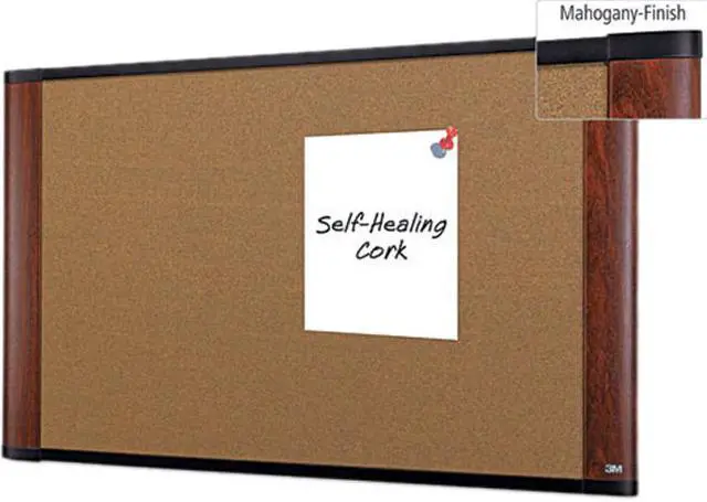 Self-healing cork bulletin board is made with graphite blend cork for a professional appearance. Dense fiberboard backing is sealed to resist warping and reduce moisture absorption. Frame has a wide-screen style and mahogany finish. Install with included mounting brackets and Command Picture Hanging Strips to stabilize the bottom. Frame is securely fastened using screws for durability.
