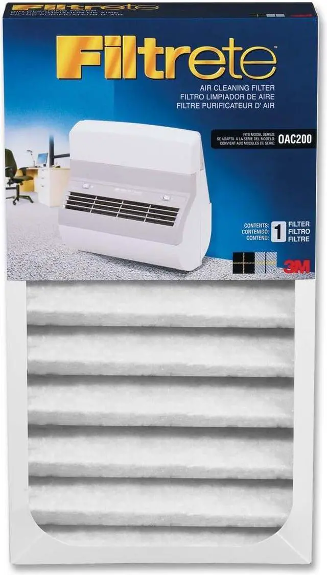 Replacement air filter is designed for use with 3M Office Air Cleaner model OAC200 that cleans a room up to 20' x 33' or 726 square feet in size. Filtrete filter technology helps reduce airborne dust, pollen and particulates down to 0.01 microns. Filter is easy to change.