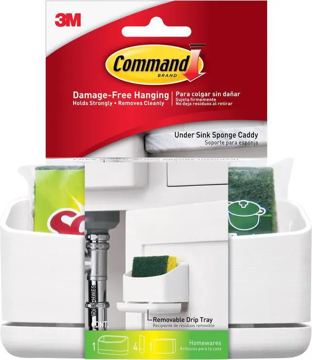 Keep the sink tidy with the Command Under Sink Sponge Caddy. Your sponge stays out of sight, but within reach when needed, by hanging it under the sink cabinet or on tile backsplash. Drain holes in the caddy allow excess water to drip out. Tray at the base catches any drippy mess but removes for quick cleaning. Using revolutionary Command Adhesive, Command products hold strongly on a variety of surfaces, including paint, wood, tile and more. Caddy removes cleanly - no holes or sticky residue. Both caddy and tray are dishwasher-safe. Caddy comes with four medium mounting strips and one Scotch-Brite Heavy-Duty Sponge. The included sponge works on a variety of indoor surfaces, such as painted drywall, finished wood, tile, metal and glass.