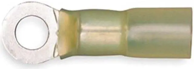 Ring Terminal, Insulation Color Yellow, Maximum Operating Temperature 221 Degrees F, Maximum Voltage 600 V, Minimum Wire Size 12 AWG, Maximum Wire Size 10 AWG, Termination Style Crimp, Tongue Width 0.38 in, Contact Material Copper, Standards CSA Certified, UL Listed, Insulation Type Heat Shrink, Overall Length 1.1 in, Package Quantity 25. This item has been restricted from sale in the following state (s): []