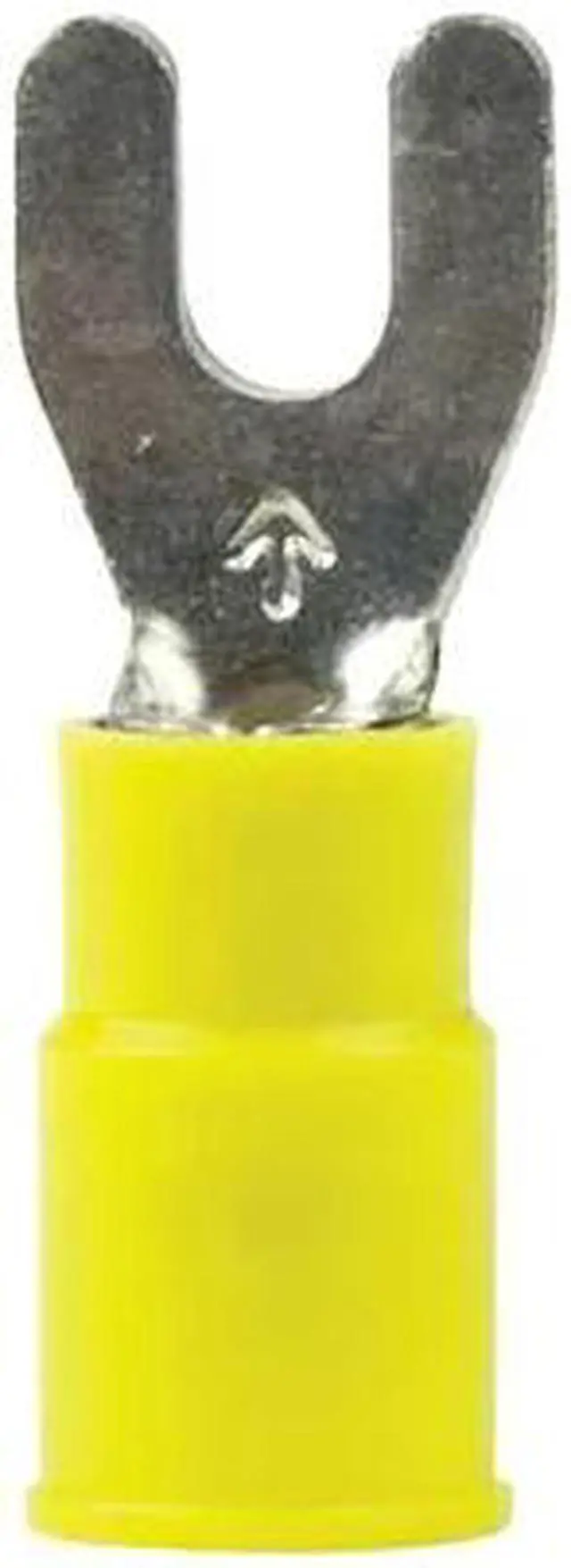Fork Terminal, Contact Finish Tin, Contact Material Copper, Insulation Color Yellow, Insulation Material Nylon, Maximum Operating Temperature 221 Degrees F, Maximum Voltage 600 V, Maximum Wire Size 10 AWG, Stud Size #10, Termination Style Crimp, RoHS Compliant Yes, Seam Style Butted, Standards CSA Certified, UL Listed, Barrel Length 0.55 in, Barrel Style Insulation Grip, Connection Material Copper, Connection Type Crimp, Minimum Wire Size 12 AWG, Overall Length 1.03 in, Package Quantity 50. This item has been restricted from sale in the following state (s): []