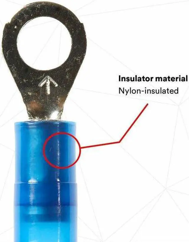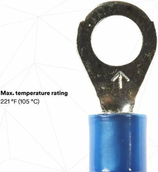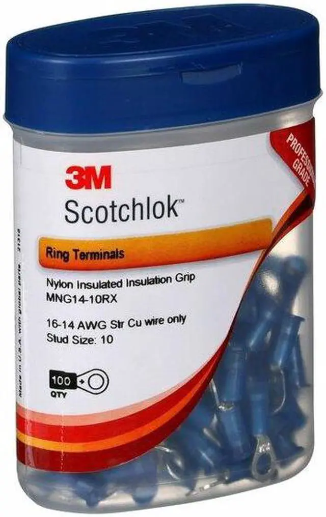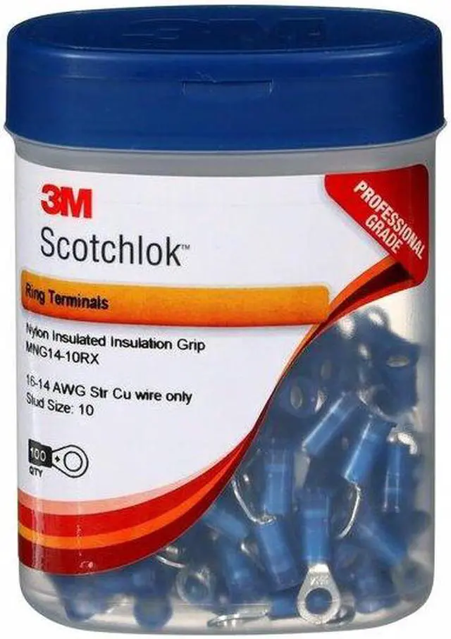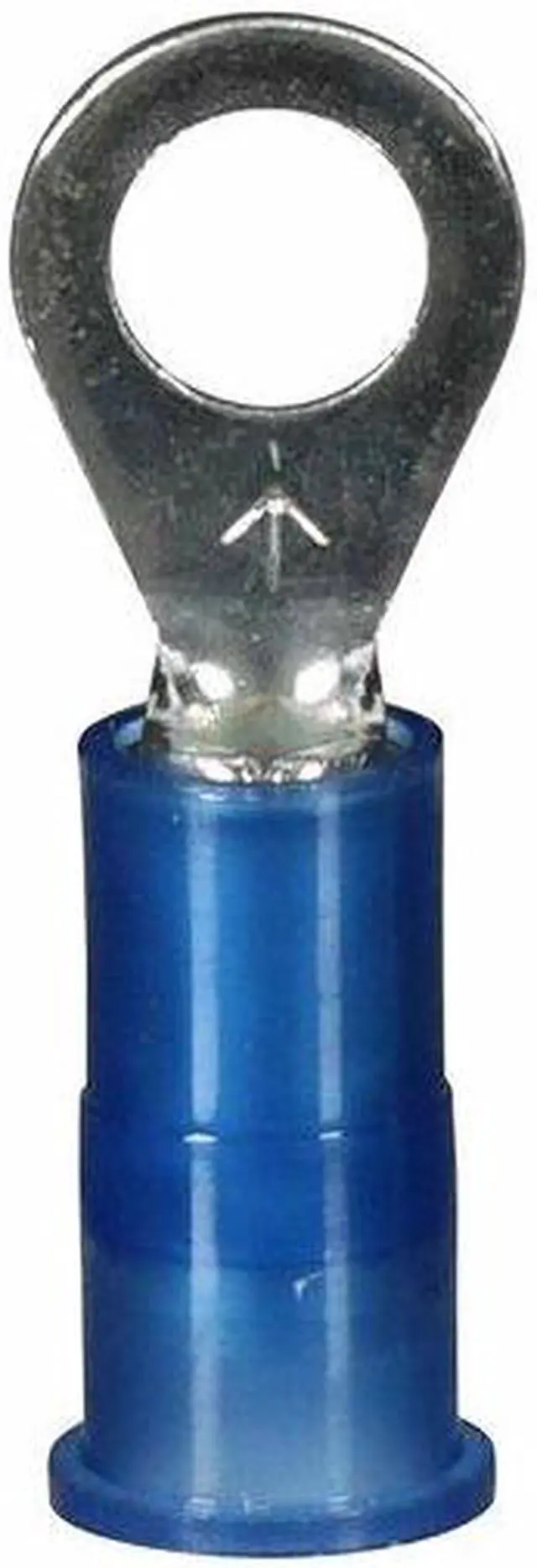 Ring Terminal, Insulation Type Nylon, Stud Size #10, Wire Range 16 to 14 AWG, Insulation Color Blue, Seam Brazed, Max. Temp. 221 Degrees F, Max. Voltage 600 V, Overall Length 1.03 in, Connection Material Copper, Standards CSA Certified, UL Listed, Terminal Connection Crimp, Tongue Width - Wire Connector 0.33 in, Package Quantity 100. This item has been restricted from sale in the following state (s): []