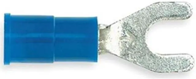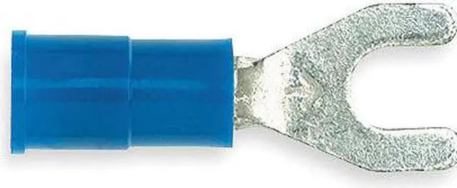Fork Terminals, Contact Finish Tin, Contact Material Copper, Insulation Color Blue, Insulation Coverage Partial Coverage, Insulation Material Vinyl, Maximum Operating Temperature 221 Degrees F, Maximum Voltage 600 V, Maximum Wire Size 14 AWG, Stud Size #6, Termination Style Crimp, Tongue Length 0.25 in, UL 94 Flammability Rating Not Applicable, RoHS Compliant Yes, Seam Style Butted, Standards OSHA, Barrel Style Butted, Compatible with Product Type Terminal Block, Connection Material Copper. This item has been restricted from sale in the following state (s): []