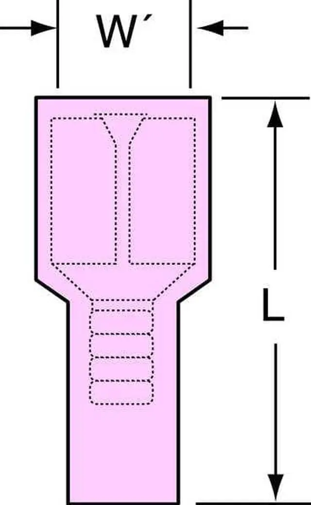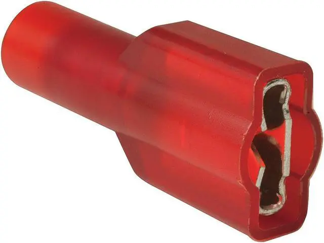 Female Disconnect, Contact Material Copper, Insulation Color Red, Insulation Coverage Full Coverage, Maximum Operating Temperature 221 Degrees F, Minimum Wire Size 22 AWG, Maximum Wire Size 18 AWG, Maximum Voltage 600 V, Tab Thickness 0.02 in, Tab Width 0.187 in, Terminal Type Female Disconnect, Termination Style Crimp, Seam Style Butted, Standards CSA Certified, RoHS Compliant, UL Listed, Barrel Inside Diameter 0.085 in, Overall Length 0.81 in, Package Quantity 100. This item has been restricted from sale in the following state (s): []