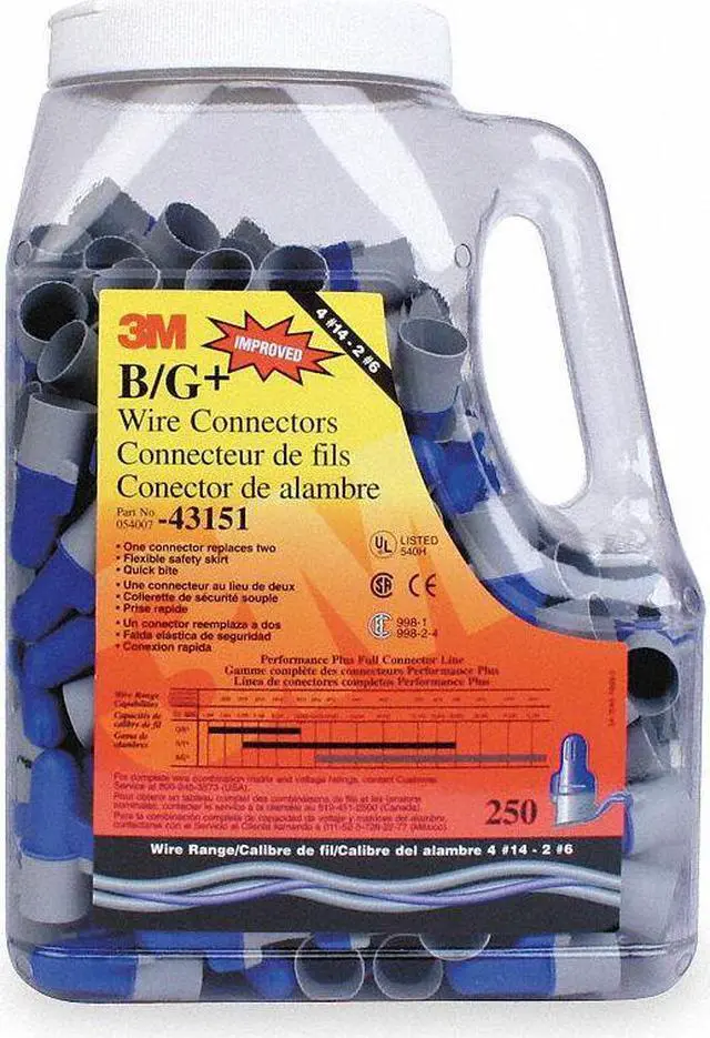 Twist On Wire Connector, Color Blue/Gray, For Conductor Material Copper, Maximum Operating Temperature 221 Degrees F, Maximum Voltage 600 V, Minimum Wire Combination (4) 14 AWG, Maximum Wire Combination (2) 6 AWG, Contact Material Steel, UL 94 Flammability Rating V-2, Maximum Conductors 6, Standards CSA Certified, UL Listed, Wire Connector Style Standard, Insulation Material Polypropylene/Thermoplastic Elastomer, Maximum Single Wire Size 6 AWG, Minimum Single Wire Size 14 AWG. This item has been restricted from sale in the following state (s): []