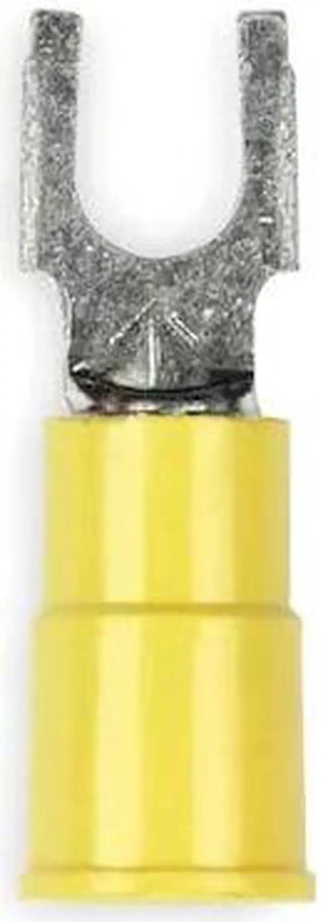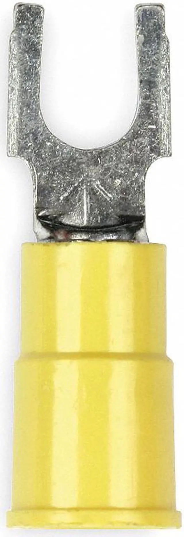 Fork Terminal, Insulation Color Yellow, Maximum Operating Temperature 221 Degrees F, Maximum Voltage 600 V, Maximum Wire Size 10 AWG, Stud Size #6, Seam Style Butted, Standards CSA Certified, UL Listed, Connection Material Copper, Connection Type Crimp, Minimum Wire Size 12 AWG, Overall Length 1.03 in, Package Quantity 25