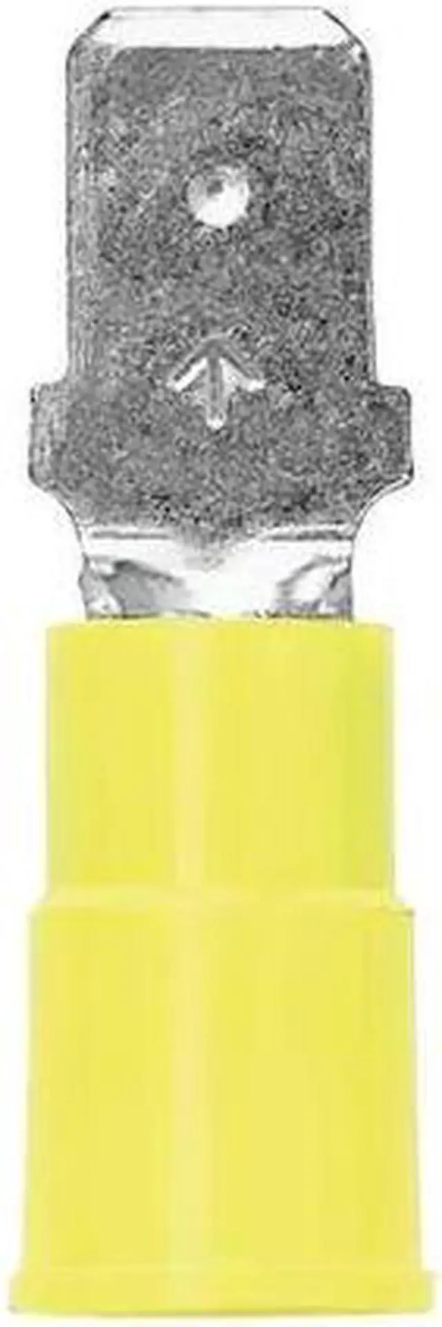 Wire Disconnect, Contact Finish Tin, Contact Material Copper, Disconnect Style Quick Disconnect, Insulation Color Yellow, Insulation Coverage Partial Coverage, Insulation Material Vinyl, Maximum Operating Temperature 221 Degrees F, Minimum Wire Size 12 AWG, Maximum Wire Size 10 AWG, Maximum Voltage 1, 000 V, Tab Thickness 0.032 in, Tab Width 0.11 in, Terminal Type Tab, Termination Style Crimp, Seam Style Butted, Standards CSA Certified, EU Compliant, UL Listed, Barrel Inside Diameter 0.15 in. This item has been restricted from sale in the following state (s): []