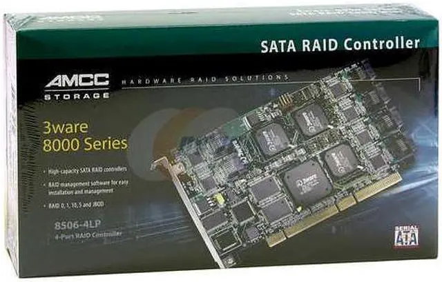 AMCC Storage combines an advanced non-blocking switched fabric architecture StorSwitch, with SATA drives to deliver a highly scalable hardware RAID storage solution. Each controller boasts a PCI 66MHz custom ASIC that combines an integrated RISC processor, PCI bridge (64-bit, 66MHz) and XOR RAID engine. The 3ware 8506-4LP offers the most popular Serial ATA RAID 5 as well as Levels 0,1,10 and JBOD.
