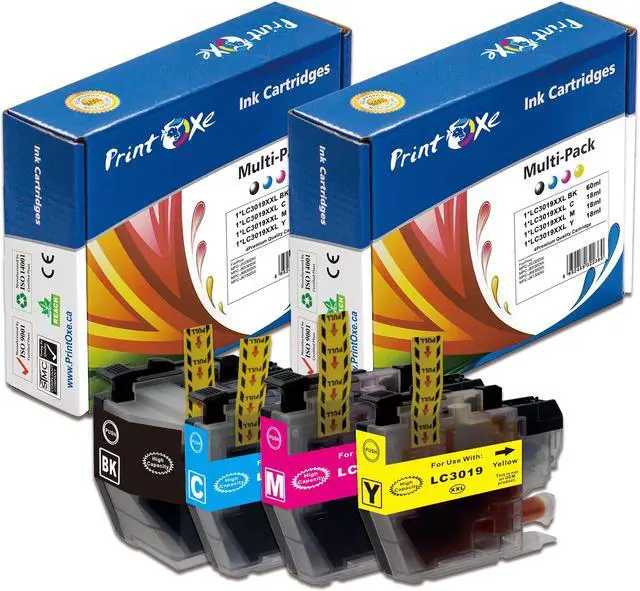 PrintOxe® 100% Compatible in Retail Package Shown in Image. Shelf Life Exceeds 24 Months. 4 Ink Cartridges Compatible for Brother LC3019 (Non OEM); Black 60ML, and Cyan, Magenta, & Yellow each 18 ML.
