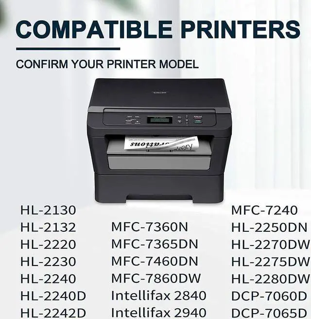 Suitable for use in Brother HL-2270DW, HL-2280DW, HL-2130, HL-2132, HL-2220, HL-2230, HL-2240, HL-2240D, HL-2242D, HL-2250DN,, HL-2275DW,; Intellifax-2840, IntelliFAX-2940; DCP-7060D, DCP-7065DN; MFC-7240, MFC-7360N, MFC-7365DN, MFC-7460DN, MFC-7860DW