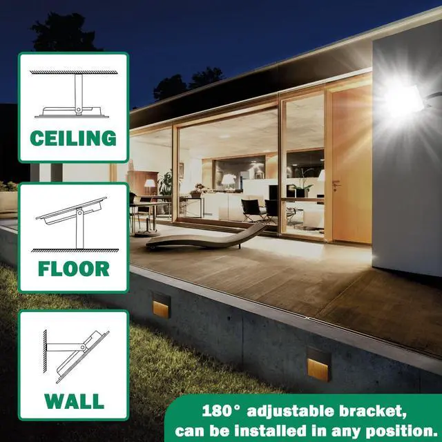 Easy to use: Plug in floodlights with 6ft long wire, standard American plug and 6 foot power cord, no wiring required, plug and play, this security lights can be easily used anywhere there is a power outlet. Equipped with a 180° adjustable bracket that illuminates with a 120° wide beam angle, you can easily install outdoor floodlights on wall, ceiling, or floor to adjust the desired angle