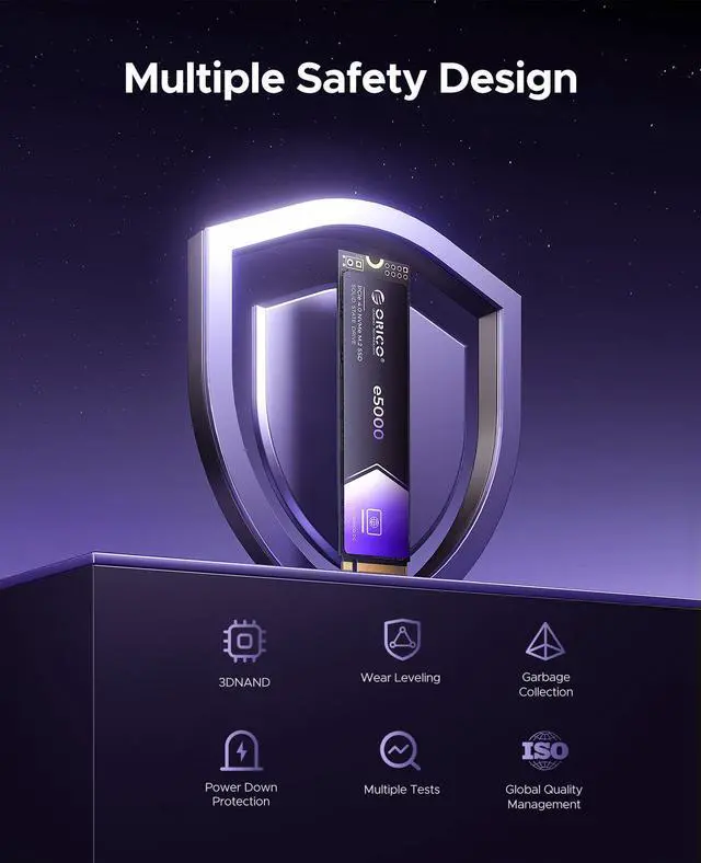 The ORICO e5000 M.2 SSD utilizes the advanced PCIe 4.0 interface to provide impressive performance, featuring read speeds of up to 5000 MB/s. Experience instant program launches, rapid file transfers, and seamless multitasking with unmatched speed and efficiency.