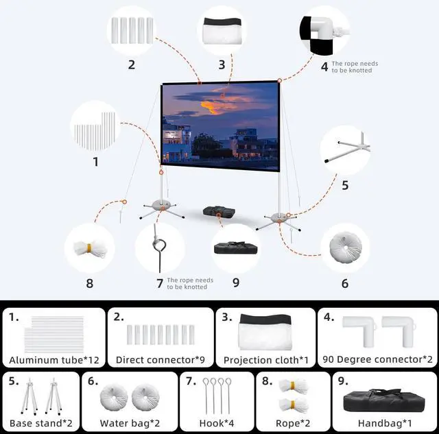 Enjoy your outdoor cinema with AODIOU Projection Screen.80 inch projection screen with stand, with high-quality wrinkle proof and anti light penetration fabric, can present clear images.The professional frame, attached wind rope and nails can make it perform stably outdoors. The ultra light frame allows your theater to be easily taken to the backyard movie night, square, camping and other occasions.