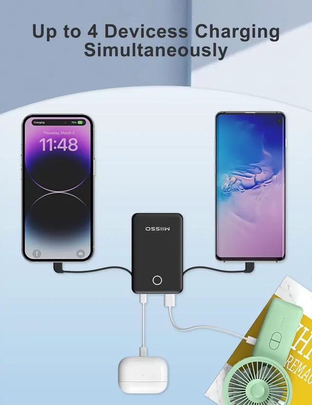 Three In One: This power bank is built-in type C cable and other cables that compatible with mobile phone directly. You do not need to take charging cables Credit Card Size: It is the slimmest and the smallest of JAYSUING portable chargers with cables, only 0.27lb(122g) and its body like a credit card. The lightweight design lets you take it out without pressure. It's slim enough to put it in your pocket or in your handbag Slim But Power: Contains 6000mAh of power. Enough to provide over an entire replacement charge for iPhone 17, or almost 1 charge for iPhone 15. 6000mAh can meet your daily electricity demand. It will be your most important partner daily Charging for 3 Devices at The Same Time: With two cables and one USB output ports , which can power up to 3 smartphones at once. Fully charging the battery charger takes only 2.5-3 hours with a 2A charger, when you are traveling or on a business trip that will be helpful What You Get: 6000mAh White Battery Charger x 1, USB cable x 1 and User Guide x 1.