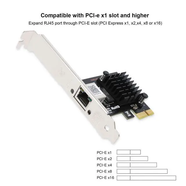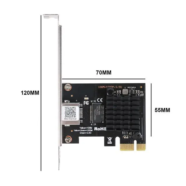 Port : 1 * Auto-Adapt RJ45 Port10M/100M/1000M/2.5G Compatible with PCIExpress 1.0 to 4.0 (support x1/x4/x8/x16) Communication Protocol Standard : Compatible IEEE 802.3 IEEE 802.3u IEEE 802.3ab Support IEEE 1588 IEEE 1588-2008 and IEEE 802.1AS Supports full-duplex half-duplex adaptive IEEE 802.3x Support IEEE 802.3bz 2.5GBase-T Support IEEE 802.3az Support IEEE 802.1Q VLAN Support IEEE 802.1and two VLAN Support OS: Part of win10/win11 is free of drive, win7/win8 needs to install the driver manually Windows Server 2012 and above need to install the driver Linux system needs to install the driver Dimensions Size: 175*148*30mm Weight: 0.12KG Operating Environment operating temperature 0 ~ 65 storage temperature -40 ~ 80