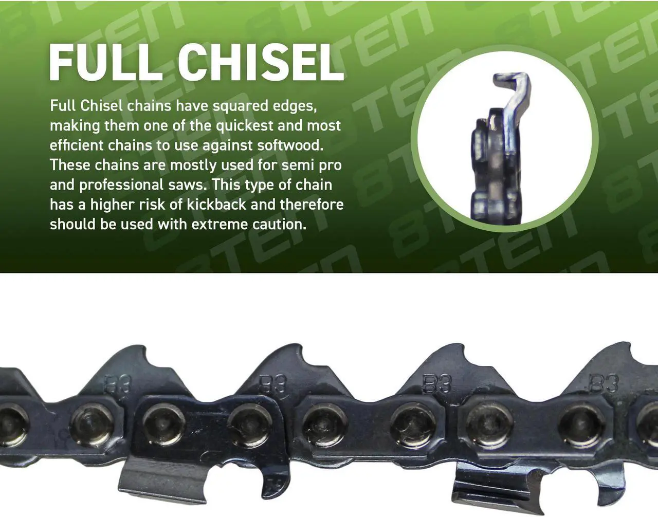 8TEN Full Chisel Chainsaw Chain 18 Inch .050 3/8 62DL for Husqvarna 235 240 Stihl Echo CS300 (3 Pack)