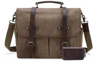 Messenger Bag for Men, 15.6 Inch Waterproof Vintage Genuine Leather Laptop Briefcase Waxed Canvas Large Computer Satchel bag Travel Leather Shoulder Work Bag with Key Bag (Brown)