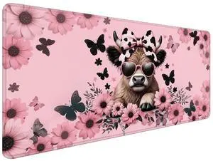 Foritho Funny Pink Floral Highland Cow Mouse Pad 31.5x15.7inch, Cute Heifer Cow Print Mouse Pads Mousepad for Work Gaming Computers Laptop Desk Accessories