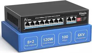 VIMIN 10-Port PoE Fast Ethernet Switch - 8 Port Unmanaged 10/100Mbps Network Switch with 2 Uplink, VLAN, Extend 250m, Support IEEE802.3af/at, 120W PoE Power, Plug & Play