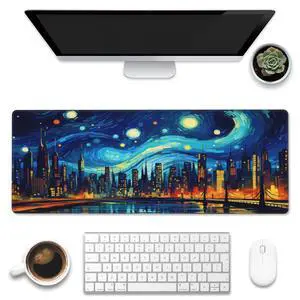 Eflxamz Desk Pad,City Starry Night Desk Mat,Abstract Oil Painting Large Gaming Mouse Pad for Desk,Extended Big Computer Keyboard Mouse Pad with Non-Slip Base and Stitched Edge,31.5"x11.8"