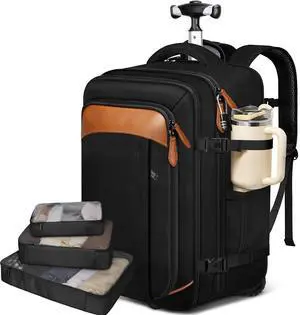 Vancropak Travel Backpack with Wheels, 17 inch Carry On Flight Approved Wheeled Laptop Backpack with 3 Packing Cubes, Expandable Water Resistant Lightweight Roller Backpack for Business, Black Brown