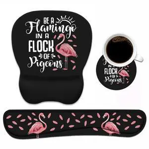 Mouse Pad Wrist Support and Keyboard Wrist Rest Set with Coasters, Inspirational Quote Be a Flamingo in a Flock Pigeons with Non-Slip PU Base Ergonomic Mousepad for Computer Laptop Home Office