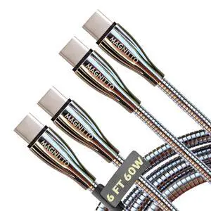 MAGNITTO Metal Braided Wire USB C to USB C Cable 6ft, 2Pack, 60W 3A, Stainless Steel, Strong Durable Wire, Tangle Free, Pets Chewing Proof, Silver