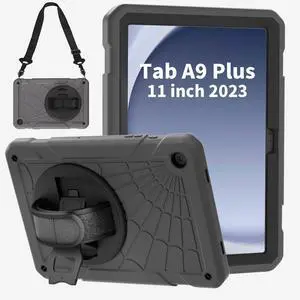 PZJI Case for Samsung Galaxy Tab A9+ / a9 Plus 11'' 2023 (SM-X210/X216/X218), Shockproof Hard Duty Case with 360 Rotating Hand Strap&Stand+Shoulder Strap for Tab A9+ Tablet (Gray+Black)