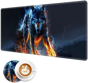 FXIANGWL XXL Gaming Mouse Pad, Extra Large Waterproof Desk Mat for Office Gaming, Non-Slip Rubber Base Durable Stitched Edge, Easy to Clean, Fire Wolf
