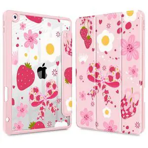 Lepeoac for iPad 9th Generation with Pencil Holder, iPad 8th/7th Gen Case 10.2-inch, [Built in Pencil Holder] Trifold Stand Auto Wake/Sleep Clear TPU Protection Back Cover, Strawberry Bow