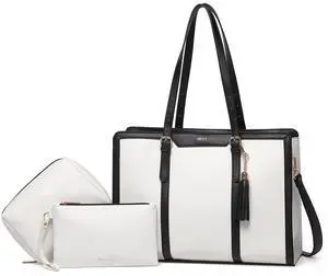 Keyli Laptop Bag for Women 15.6 inch Lightweight PU Leather Laptop Tote Bag, Large Capacity Work Briefcase Computer bag with Clutch Purse for Business, Work, Office, Travel, School Beige Black 3PCS