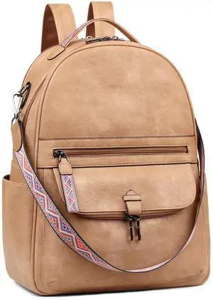 FADEON 15.6 inch Leather Laptop Backpack Purse for Women, Designer Travel PU Backpack with Laptop Compartment for Work Camel
