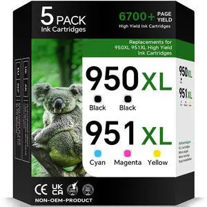 950XL 951XL Ink Cartridges Combo Pack Compatible Ink Cartridge for HP 950 951 XL (2 Black, Cyan, Magenta, Yellow) 5-Pack Work with OfficeJet Pro 8600 8610 8620 8100 8630 8660 8640 76DW 251DW Printer